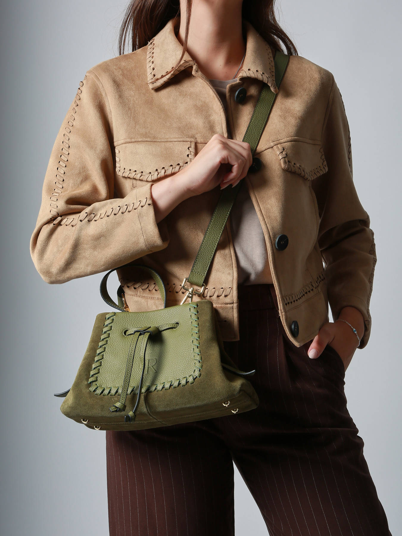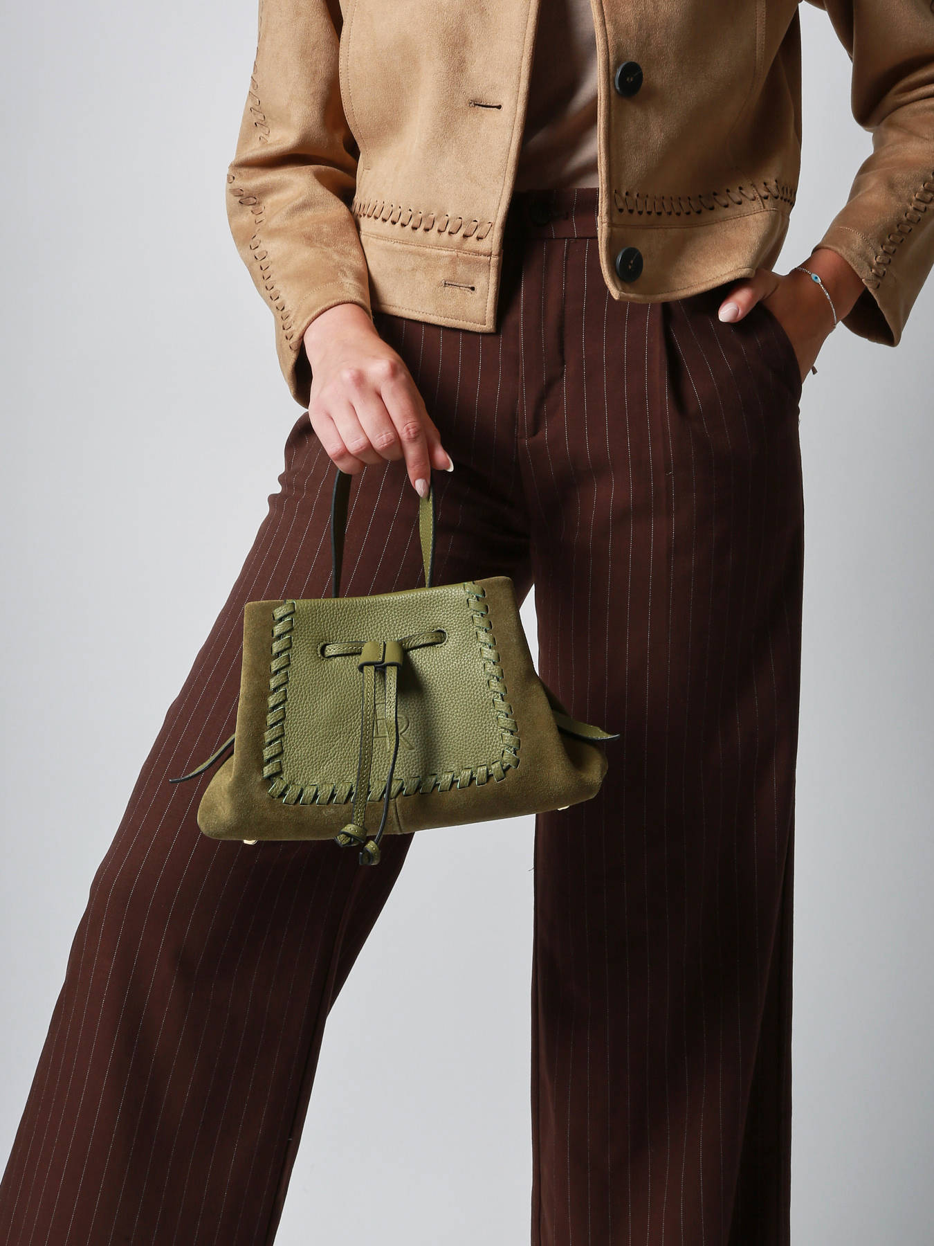 The small-sized shoulder bag from the BRUMBY line by ETRIER combines charm and modernity thanks to its two-tone design in smooth leather and velvet leather. Its delicate weaving adds a subtle touch of elegance. Compact and functional, this model can be carried either by hand or as a shoulder bag thanks to its removable strap included. Its zip closure ensures the security of your essentials. A refined and practical bag, perfect for a polished everyday style.